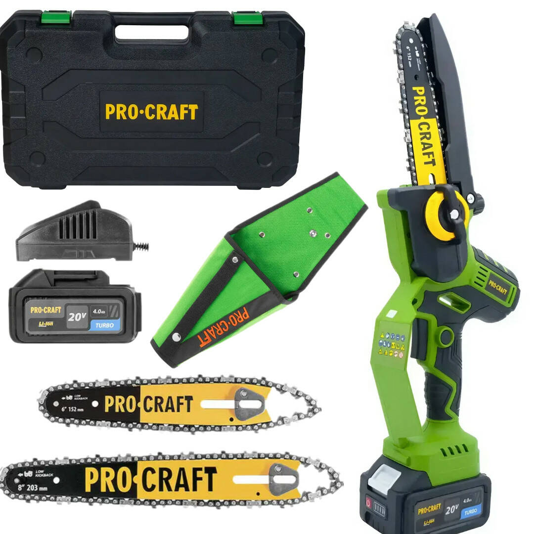 Акумуляторна ланцюгова пила PROCRAFT PKA-32Li 6"/8" (152 мм/203 мм), 2 шини + 2 ланцюги 20 V/4 Ah (кейс + кобура)