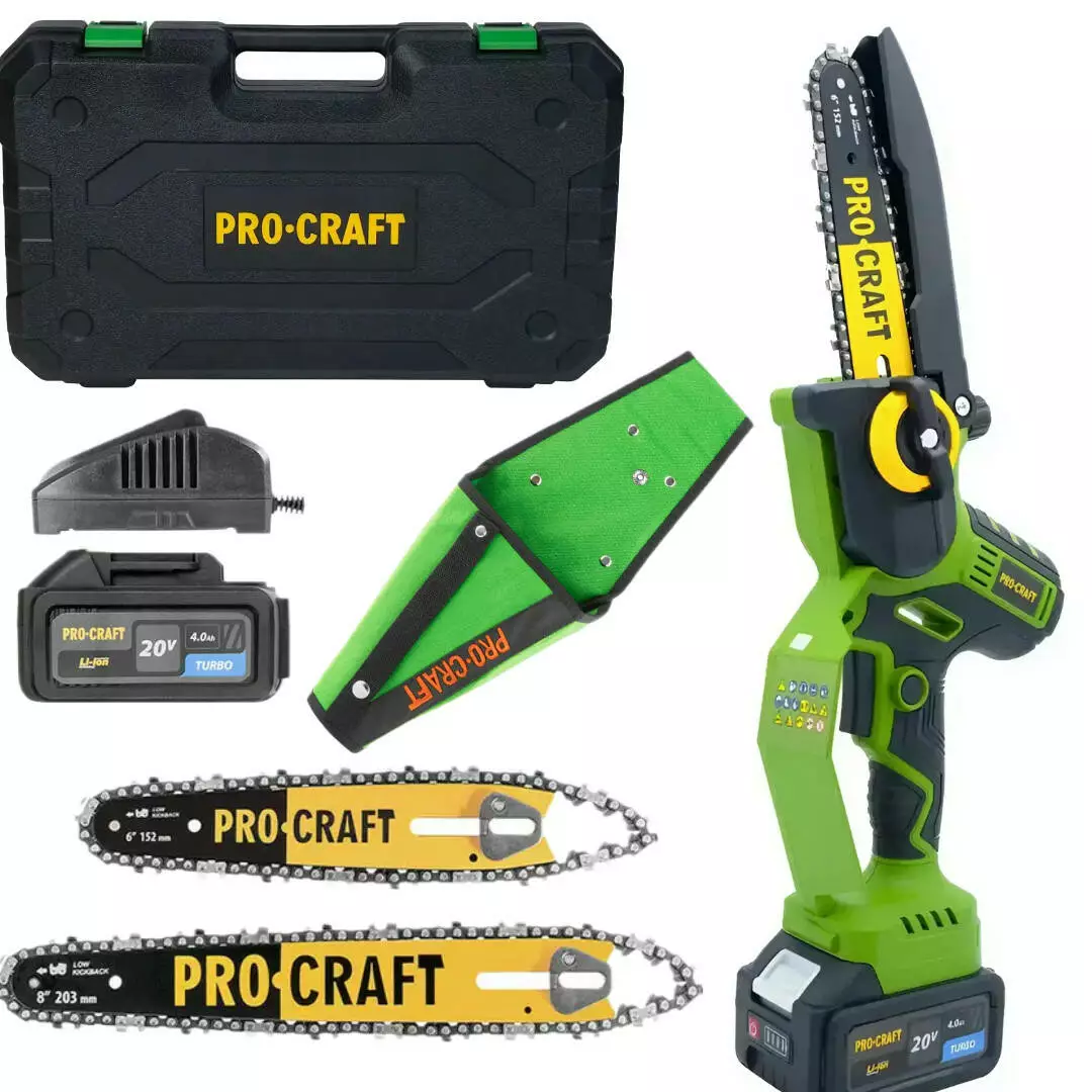 Акумуляторна ланцюгова міні пила ProCraft PKA33 — це компактний, потужний і універсальний інструмент для догляду за садом, обрізання гілок і виконання різних господарських робіт. Модель обладнана безщітковим двигуном, який вирізняється високою ефективністю, довговічністю й економною витратою енергії. Завдяки двом змінним шинам 6" і 8" (152 мм і 203 мм) інструмент легко адаптується під різні завдання: від точного обрізання гілок до розпилювання невеликих брусів і нарізки дров. Швидкість ланцюга 7 м/с забезпечує швидке й акуратне різання деревини без зайвих зусиль. Живлення здійснюється від акумулятора 20 В 4 А· год, що дає змогу працювати автономно без дротів і бензину. Невелика вага та продумана конструкція дають змогу зручно використовувати пилку навіть однією рукою, що особливо важливо під час роботи на висоті або у важкодоступних місцях. Завдяки компактним розмірам інструмент ідеально підходить для садівників, дачників і власників приватних будинків.
