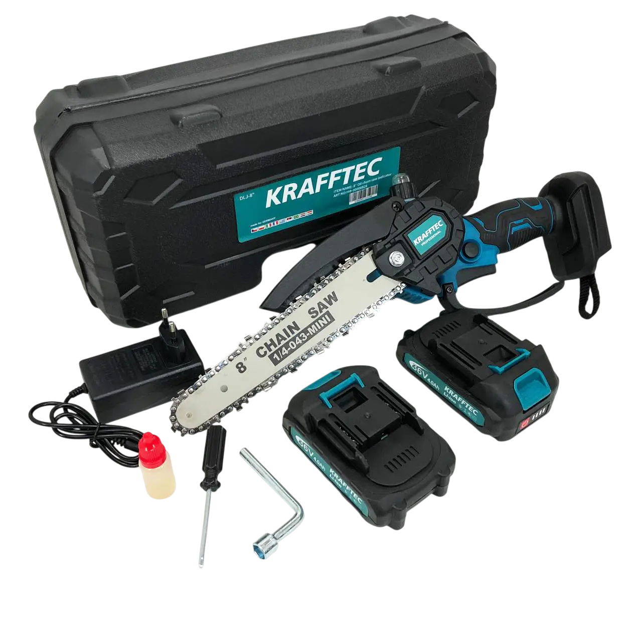 Головна особливість моделі — напрямна шина завдовжки 20 см, яка забезпечує оптимальний баланс між компактністю та продуктивністю. Це дає змогу легко виконувати обрізання гілок, формування крони дерев, заготівлі дров та різні будівельні роботи. Пила обладнана якісним ланцюгом із кроком 1/4", що забезпечує акуратний і швидкий розпил. До комплекту входять два акумулятори ємністю 4 Ah, завдяки чому можна неабияк збільшити час безперервної роботи. Міцний корпус виготовлений зі зносостійких матеріалів, стійких до навантажень і механічних впливів. Проста система обслуговування та швидка заміна ланцюга роблять інструмент максимально зручним в експлуатації. Міні пила Krafftec — це поєднання потужності, мобільності та надійності у компактному форматі.