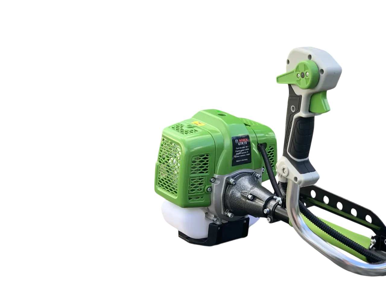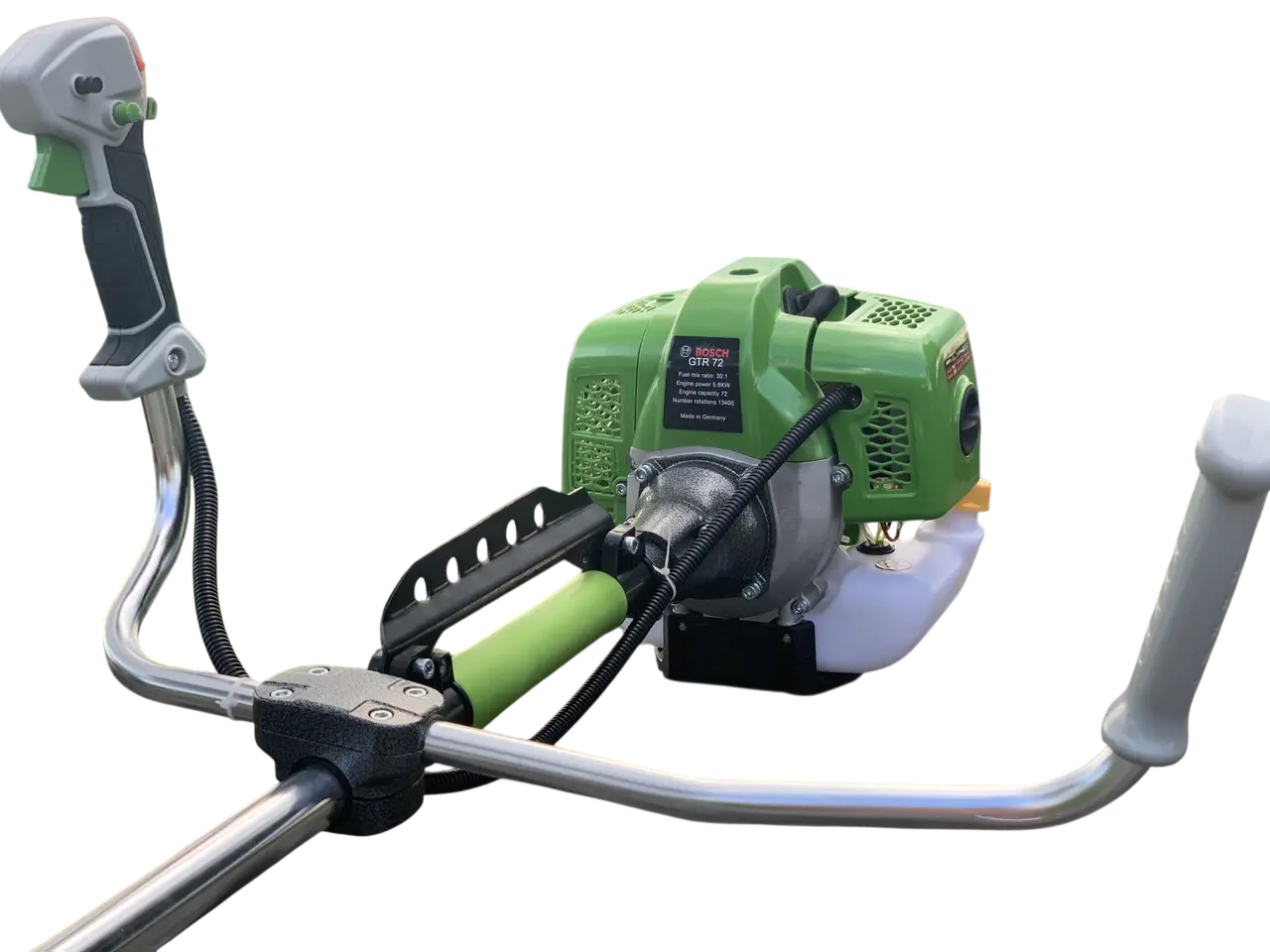 Бензинова мотокоса GTR 52 — це потужний і надійний садовий інструмент, призначений для ефективного догляду за ділянками, садами, городами та великими територіями. Модель обладнана двотактним двигуном потужністю до 5,5 кВт, який забезпечує високу продуктивність і стабільну роботу навіть у разі скошування густої трави, бур'яну та жорсткої рослинності. Завдяки робочому об'єму двигуна приблизно 52 см3 коса розвиває високі оберти та легко справляється зі щільною рослинністю. Міцна конструкція містить посилений металевий приводний вал і надійний редуктор, що підвищує довговічність інструмента за інтенсивної експлуатації. Ергономічна U-подібна велосипедна ручка забезпечує зручне керування й точність роботи. Система повітряного охолодження запобігає перегріванню двигуна та дає змогу працювати тривалий час без зупинок. Антивібраційна система знижує навантаження на руки оператора, роблячи роботу комфортною навіть у разі тривалого використання. Такий інструмент чудово підійде як для приватного використання на дачі, так і для професійних завдань.