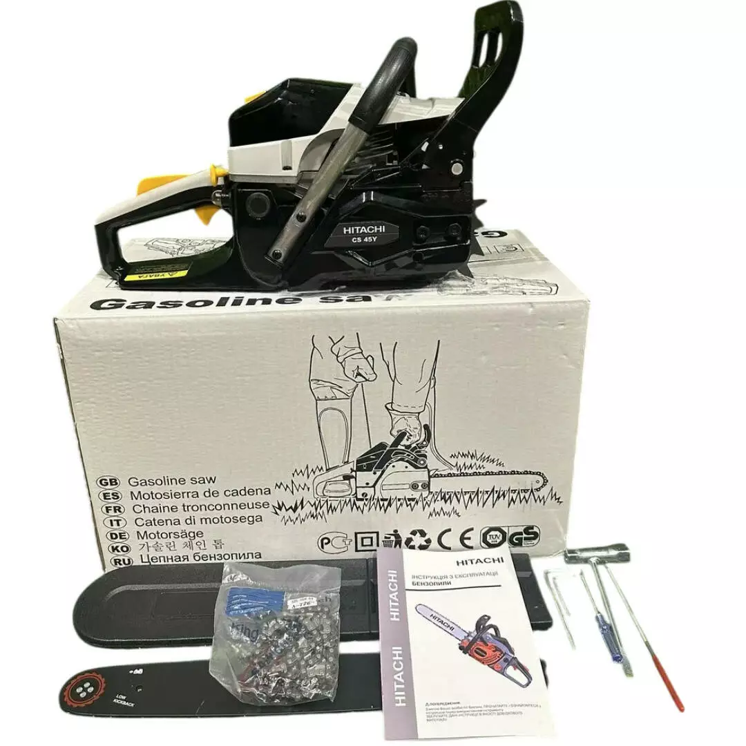 Бензинова ланцюгова пила Hitachi CS-45-Y — потужний і надійний інструмент, призначений для розпилювання дров, догляду за садом, валки невеликих дерев і будівельних робіт. Модель обладнана двотактним двигуном потужністю 4,2 кВт (5,7к.с.), який забезпечує високу продуктивність і стабільну роботу навіть у разі інтенсивних навантажень. Завдяки шині завдовжки 45 см пилка легко справляється з розпилюванням товстих колод і деревини різної щільності. Високі оберти двигуна до 12000 об/хв дають змогу виконувати швидке та точне різання.