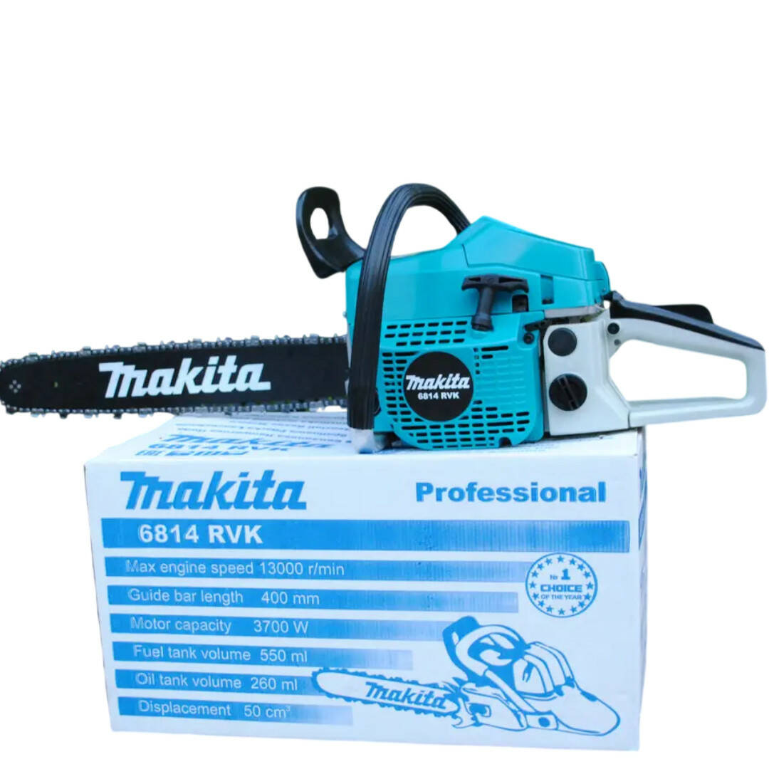 Бензинова ланцюгова пила Makita 6814 RVK — це потужний і надійний інструмент, призначений для ефективної роботи з деревиною в домашніх і господарських умовах. Завдяки двотактному двигуну потужністю 3,7 кВт (приблизно 5 л.с.) і робочому об'єму 50-52 см3 пилка забезпечує високу продуктивність і легко справляється з розпилюванням колод, дощок і щільної деревини. Довжина шини 45 см дає змогу працювати з великими брусками, що робить інструмент чудовим вибором для заготівлі дров, догляду за садом і будівельних робіт. Пила вирізняється міцною конструкцією, стійкою до навантажень, і розрахована на регулярне використання в господарстві.