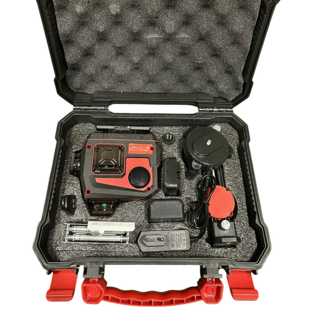 Нівелір обладнаний самовирівнювальним механізмом з точністю до ±0,2 мм/м, завдяки чому ви отримуєте ідеально рівні лінії без ручного настроювання. Додаткові функції, як-от Bluetooth керування й дистанційний пульт, дають змогу керувати пристроєм на відстані, що особливо зручно під час роботи поодинці. Вбудований LCD-дисплей відображає рівень заряду, активні площини та відхилення, забезпечуючи повний контроль над процесом.