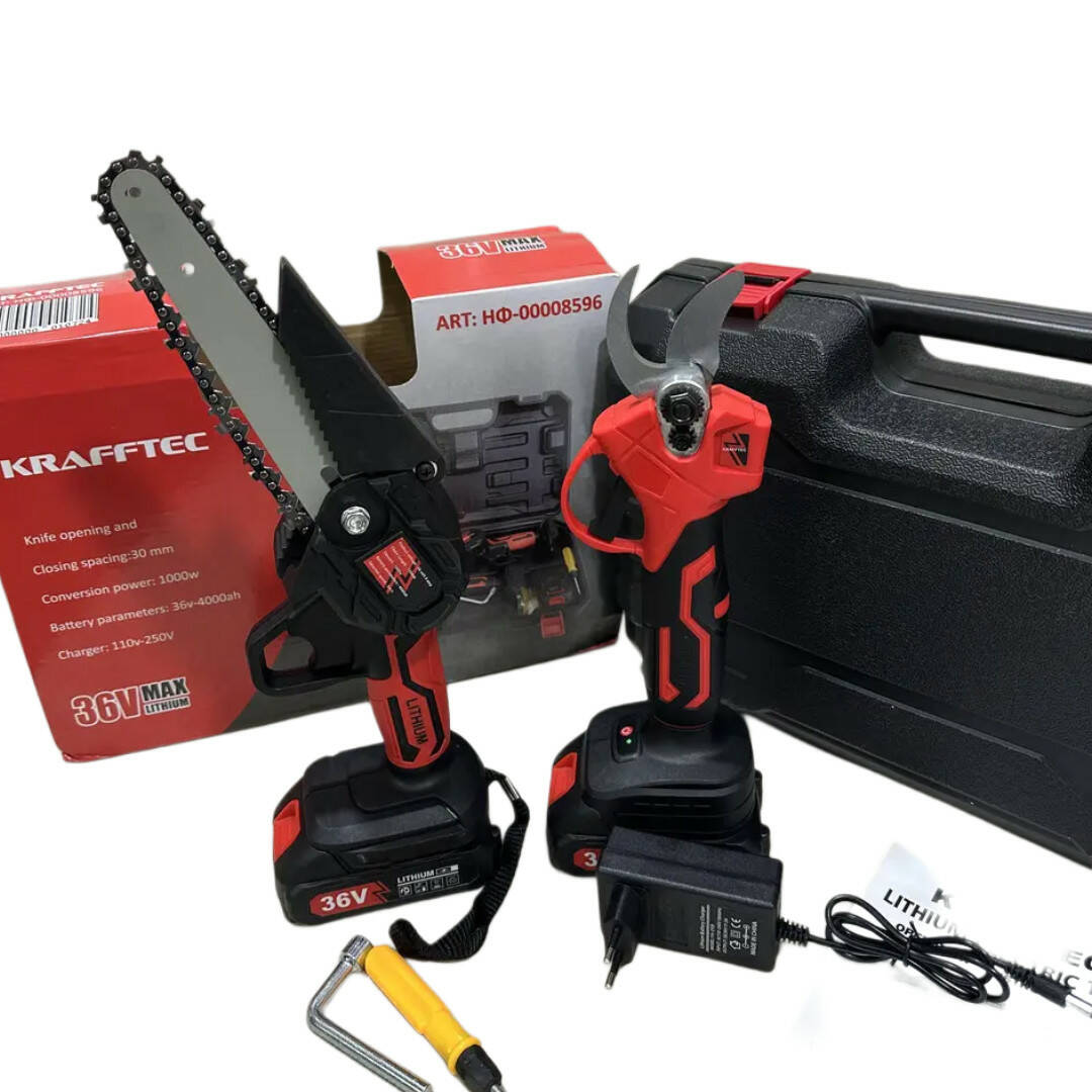Акумуляторний набір 2в1 36V Krafftec — Ланцюгова пила + Секатор, 36 В, 2 акумулятори 4 А· год