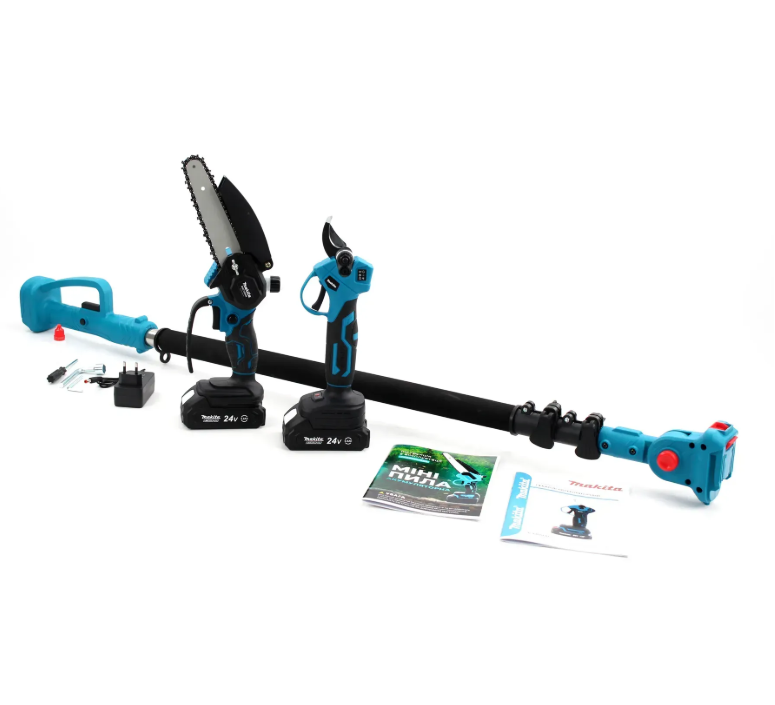 Акумуляторний набір 3в1 Makita 24V — це універсальне рішення для догляду за садом, яке поєднує в собі потужність, мобільність та функціональність ????. До комплекту входять секатор, міні-пила та телескопічна штанга, що дозволяє виконувати широкий спектр робіт без зайвих інструментів. Завдяки акумуляторному живленню ви отримуєте повну свободу рухів без прив’язки до мережі. Телескопічна штанга з довжиною до 2.6 м дає змогу легко працювати на висоті без драбини. Інструменти відзначаються ергономічним дизайном, що забезпечує комфорт навіть при тривалому використанні. Потужні двигуни гарантують ефективну роботу та точний результат. Це ідеальний вибір як для домашнього використання, так і для професійного догляду за садом ????.