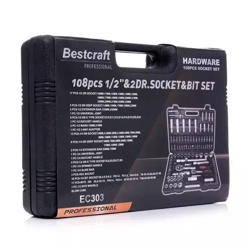 Професійний набір інструментів Kraft&Dele EC303 (108 шт) — це універсальний комплект для ремонту автомобіля, побутових робіт та обслуговування техніки. Набір містить широкий асортимент торцевих головок, біт, подовжувачів і тріскачок, що дає змогу виконувати більшість монтажних і ремонтних завдань. Усі інструменти виготовлені з хромо-ванадієвої сталі (Cr-V), яка вирізняється високою міцністю, стійкістю до зношування та корозії.