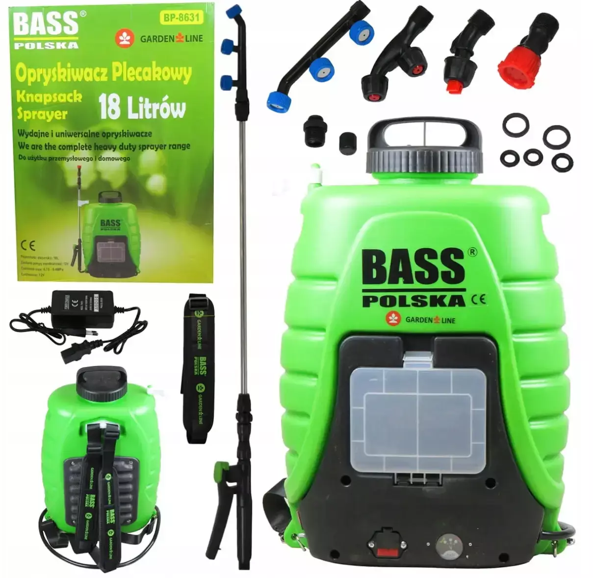 Акумуляторний ранцевий обприскувач Bass Polska 8631 18 л — потужний садовий розпилювач із насосом і акумулятором 12V