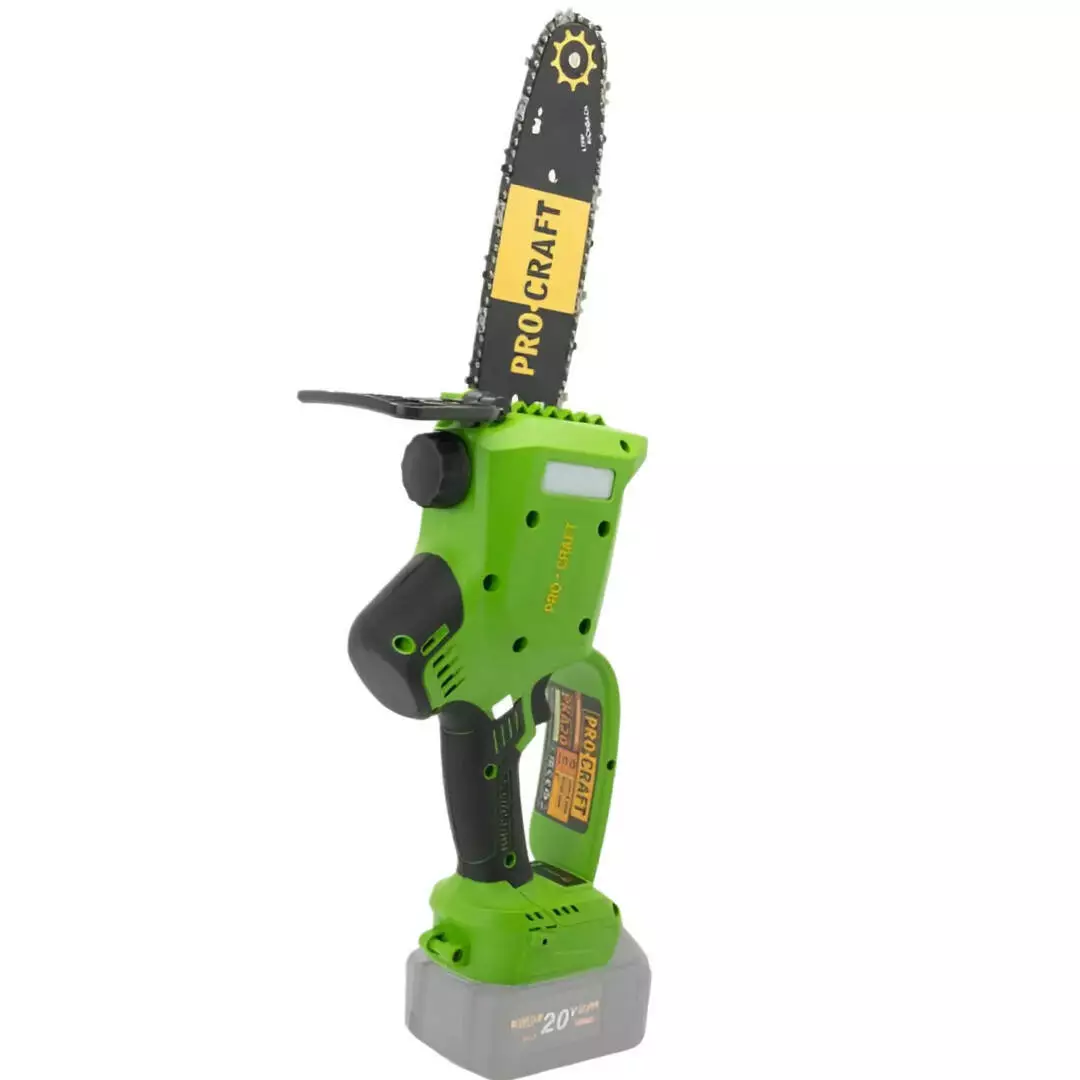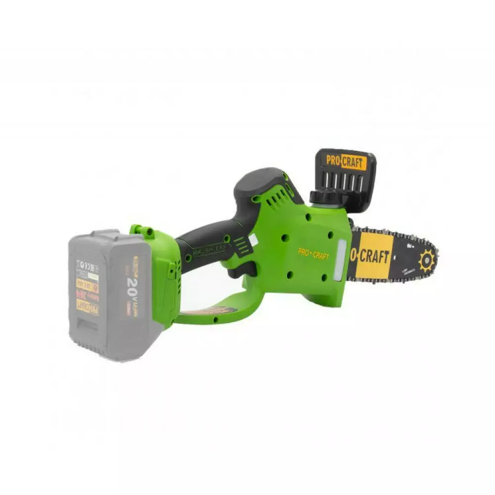 Модель обладнана шиною 8" (приблизно 20 см), яка забезпечує оптимальний баланс між компактністю й ефективністю розпилювання. Завдяки плавному пуску інструмент запускається м'яко й безпечно, знижуючи навантаження на двигун і підвищуючи термін експлуатації механізму. Безключове регулювання ланцюга спрощує обслуговування й дає змогу швидко настроїти натяг без додаткових інструментів. Рівень шуму становить приблизно 86–97 дБ, що набагато нижче, порівнюючи з бензиновими пилами. Пила відповідає класу захисту II і має ступінь захисту IPX0, що забезпечує надійну експлуатацію під час побутового використання. Якщо ви вже маєте акумулятори системи ProCraft 20 В, ви зможете використовувати їх із цією пилкою, купуючи інструмент без зайвих витрат на додаткову батарею.