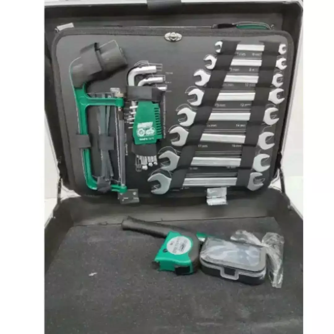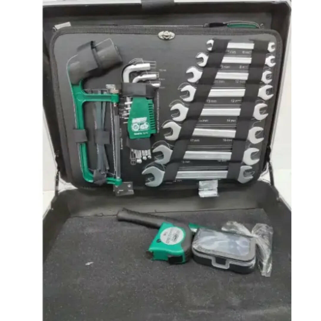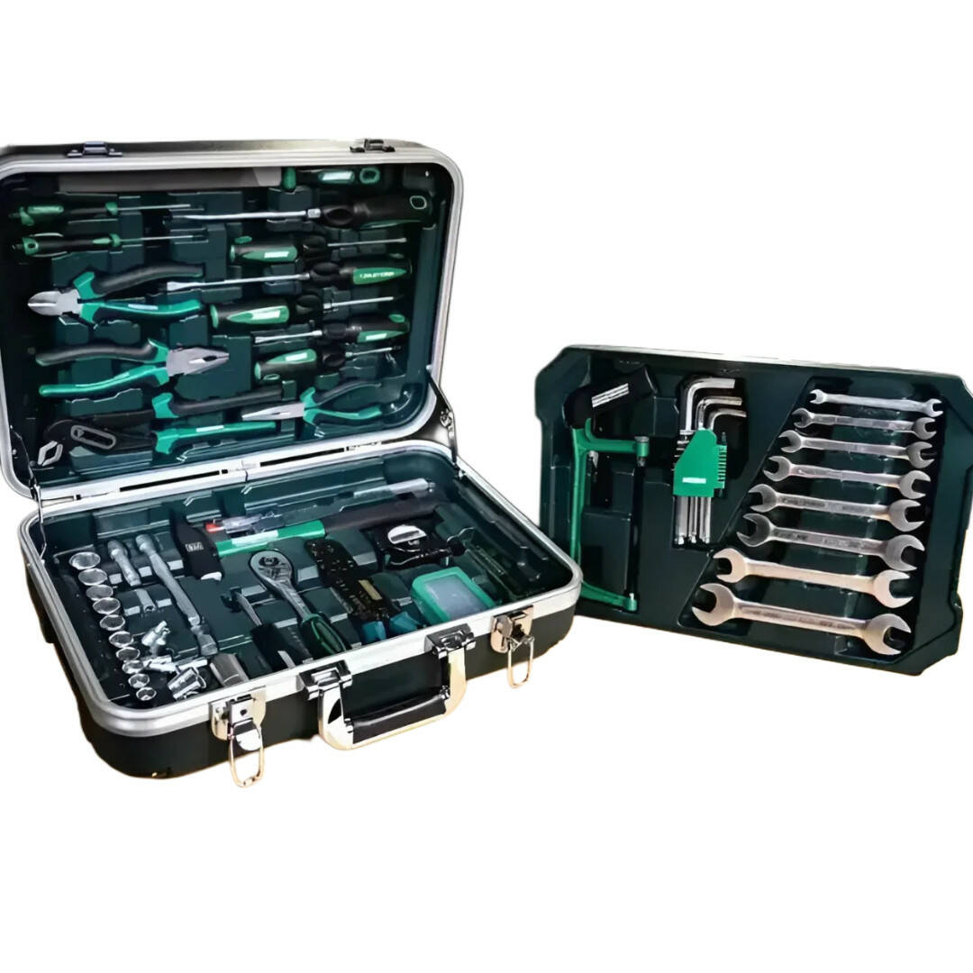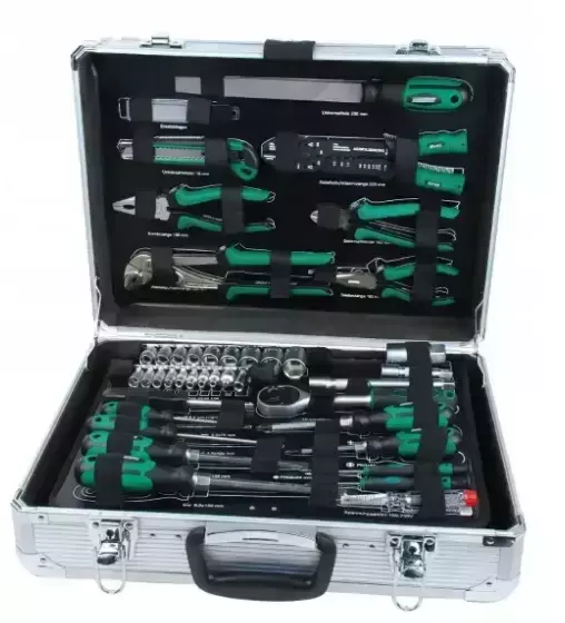 Набір постачається в міцному алюмінієвому кейсі з анодованим покриттям, який захищає інструменти від пошкоджень і забезпечує зручне зберігання. Усередині кейса інструменти розташовані в окремих відділеннях, завдяки чому вони надійно фіксуються й завжди перебувають на своєму місці. Така організація неабияк прискорює роботу, даючи змогу швидко знаходити потрібний інструмент. Компактний і зручний чемодан легко переносити та зберігати в гаражі, майстерні або автомобілі. Набір чудово підходить для ремонту автомобіля, побутових робіт, монтажу обладнання, обслуговування техніки та будівництва. До комплекту також входять вимірювальні інструменти, молоток, ножівка та додаткові аксесуари, що робить набір максимально універсальним. Якісне збирання та продумана комплектація роблять цей набір надійним помічником для будь-яких завдань. Саме тому цей комплект вважається одним із найпопулярніших універсальних наборів інструментів для дому та гаража.
