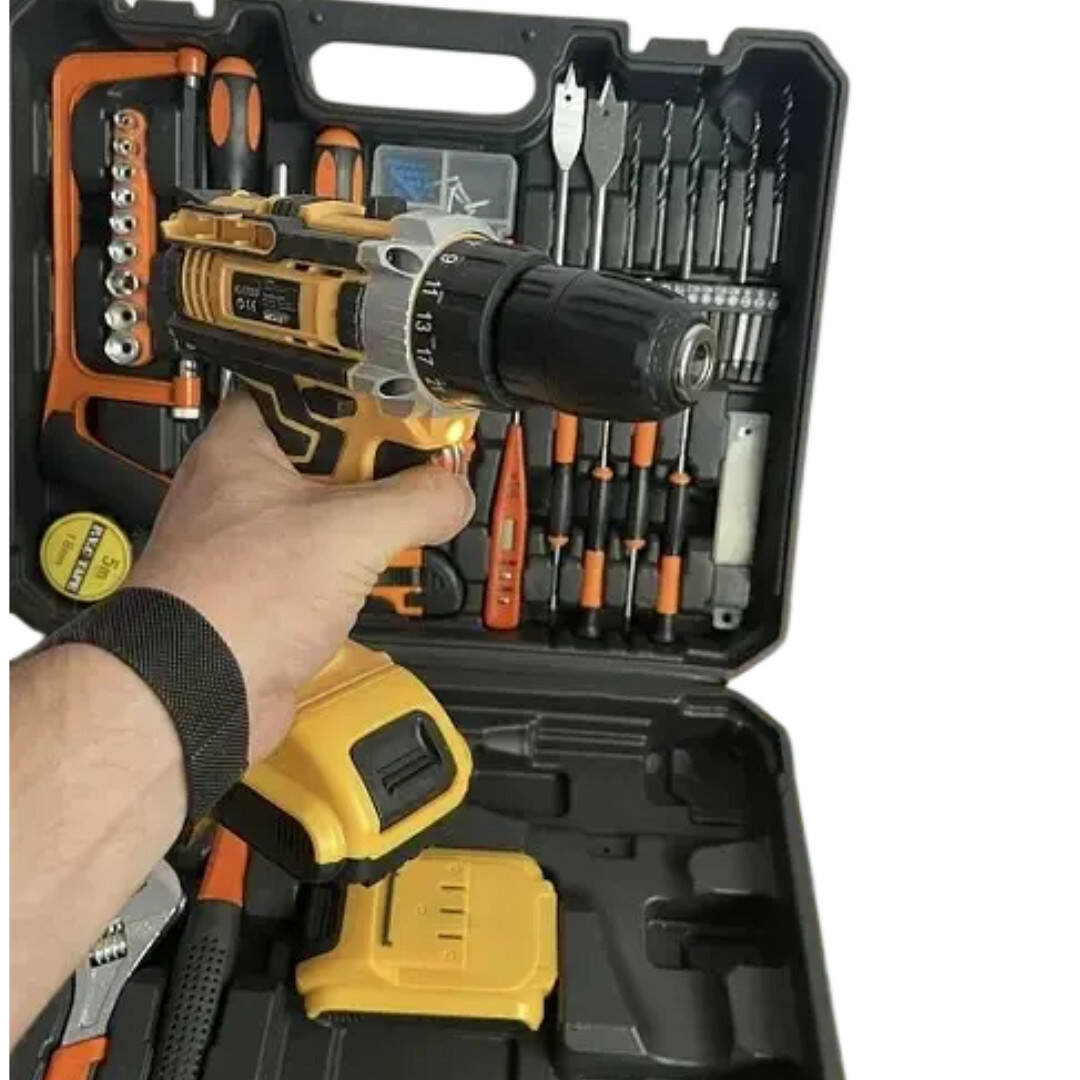 Модель обладнана двошвидкісним редуктором і регулюванням крутного моменту, що дає змогу точно настроїти інструмент під конкретне завдання. Акумулятор великої ємності (до 6 Ah) забезпечує тривалу автономну роботу без частих підзаряджень. Швидко затискний патрон 10 мм дає змогу миттєво змінювати обладнання, а вбудована LED-підсвітка робить роботу комфортною навіть у погано освітлених місцях. До комплекту входить розширений набір інструментів (викрутки, біти, свердла, рулетка, молоток та ін.), що робить цей набір повністю готовим до роботи відразу після купівлі.