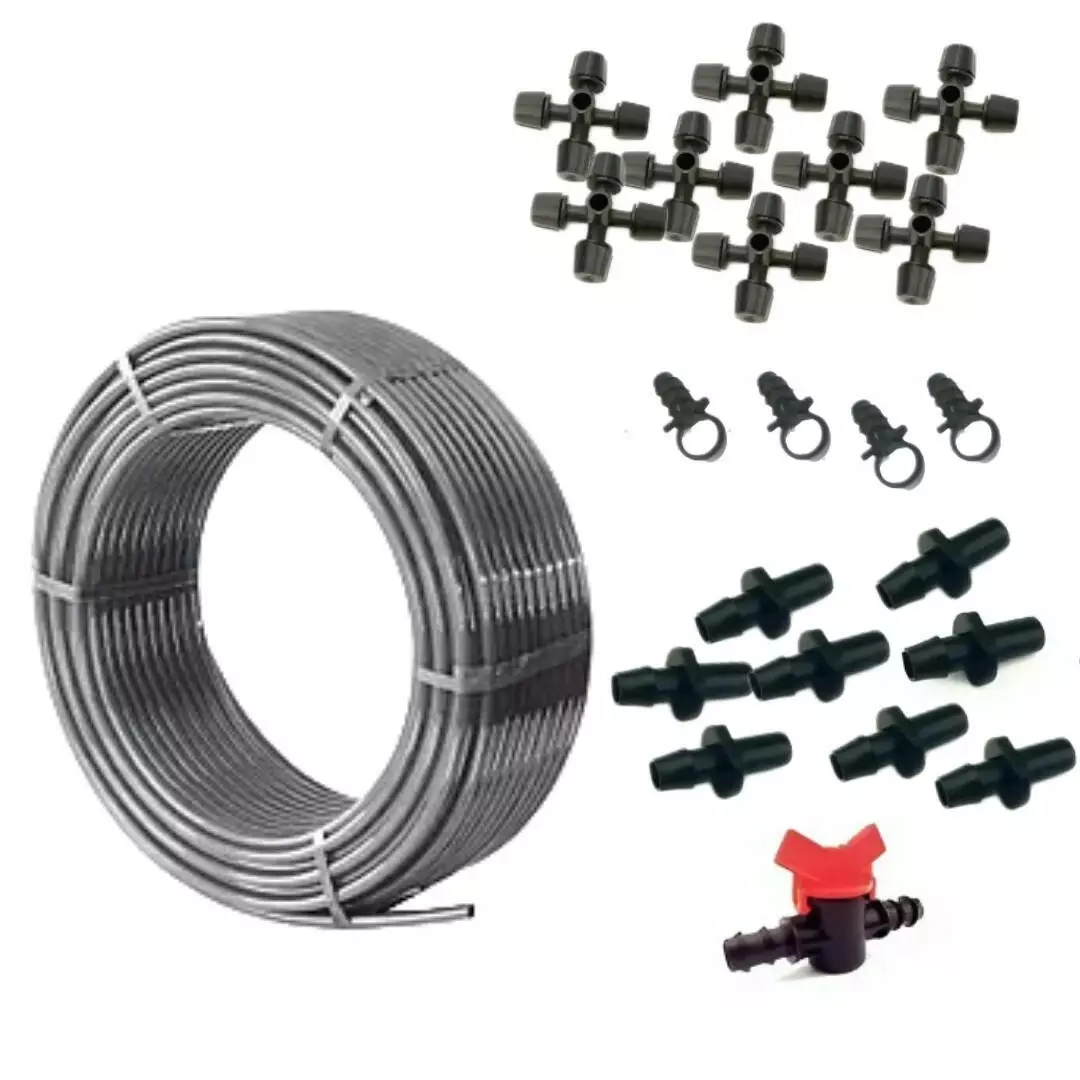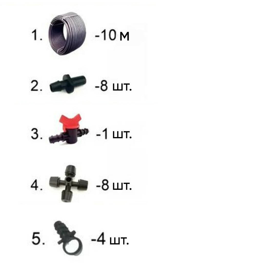 Комплект легко встановлюється всередині теплиці: система під'єднується до води через кран або бак, а форсунки, що туманно розподіляють вологу по всій площі. Конструкція розрахована на роботу упродовж усього сезону, економить воду та знижує навантаження на рослини, порівнюючи з ручним поливанням. Система забезпечує стабільне зволоження навіть за низького тиску, створюючи оптимальний мікроклімат для росту та плодоносіння.