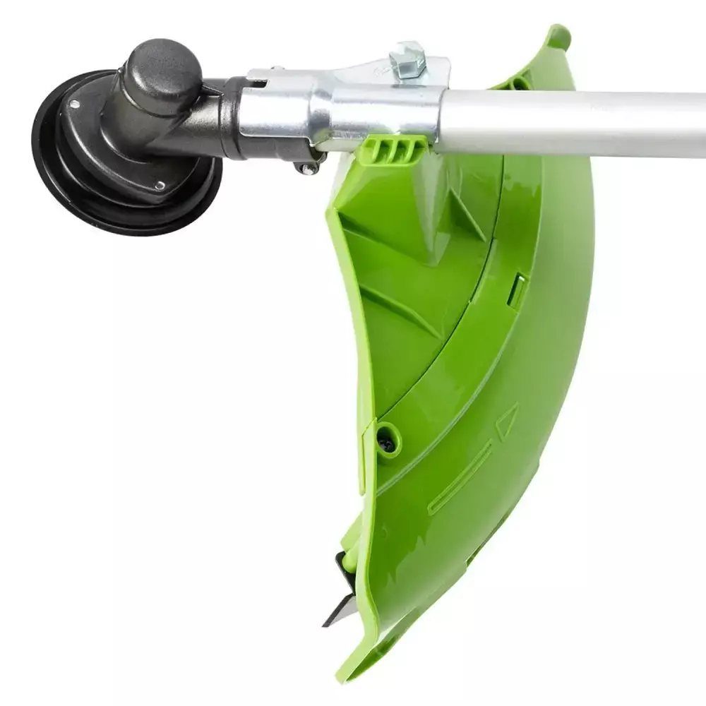 Тример обладнаний усіма необхідними функціями для комфортної й безпечної роботи: плавний запуск, захисний кожух, ремінь і надійна система фіксації різального елемента. Це універсальний інструмент, який підійде як для побутового використання, так і для професійних завдань.
